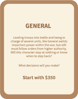 The General focuses on tactical and ethical dilemmas. In the game, they make tough choices like risking soldiers for quick wins or protecting lives for long-term stability. This role highlights the General’s perspective: balancing power, strategy, and the human cost of war.