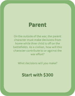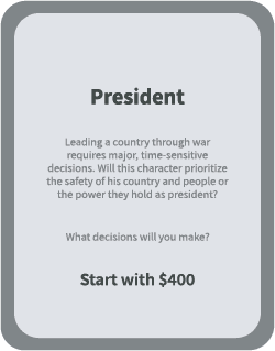 The President makes high-stakes leadership decisions negotiating peace, managing budgets, and guiding public opinion. This role reflects the President’s perspective: balancing political risk with public welfare while shaping the overall direction of the war.